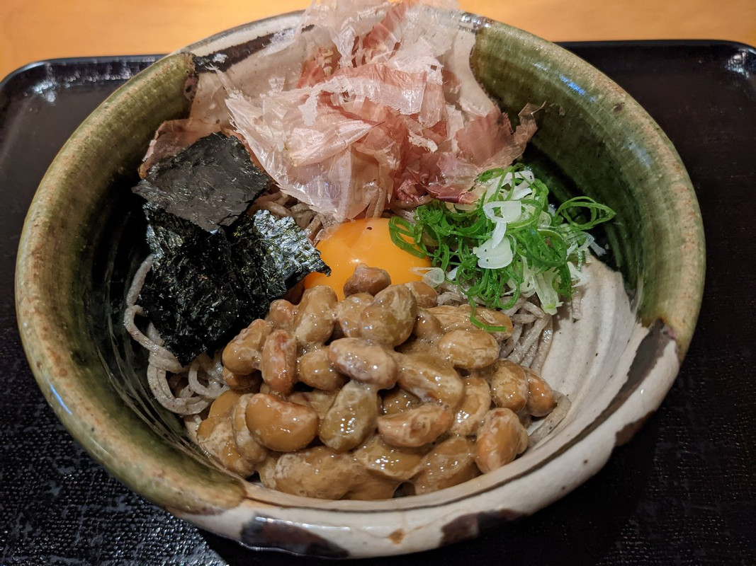 Cette fois-ci j'étais arrivée genre cinquième et ils n'avaient déjà plus de tempura. J'ai pris le bol de soba natto avec du miso grillé et des têtes de violon.